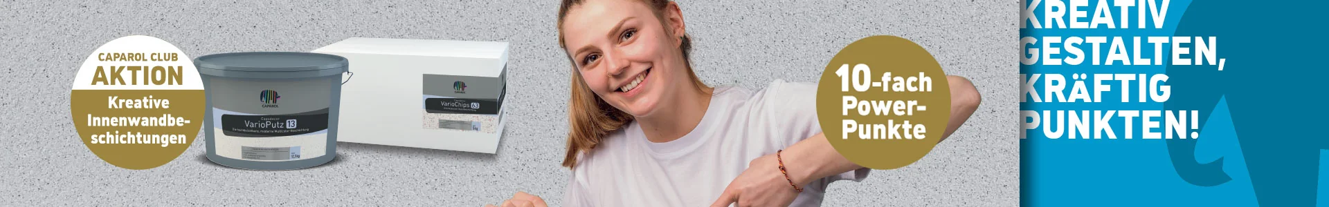 Vom 01.11.2025 bis zum 31.12.2025 erhalten Caparol Club Mitglieder beim Kauf von Capadecor VarioPutz und Capadecor VarioChips jeweils die 10-facheMenge PowerPunkte* pro Gebinde.